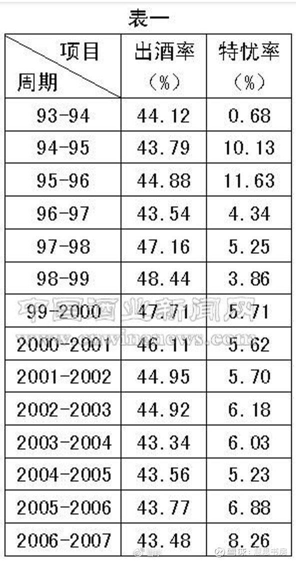 从中,我们还得知了汾酒的优酒率:特优率6%~8%,优质率55%-60%。下图为1993-2007年汾酒的特优率。可见,汾酒的优质酒也伴生着普通酒,比例大致恒定。