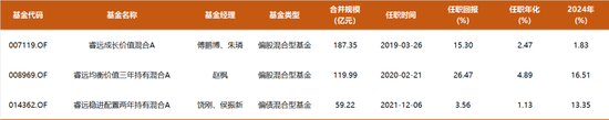 饶刚、侯振新管理的睿远稳进配置、赵枫管理的睿远均衡价值分别取得了13.35%、16.51%的收益;