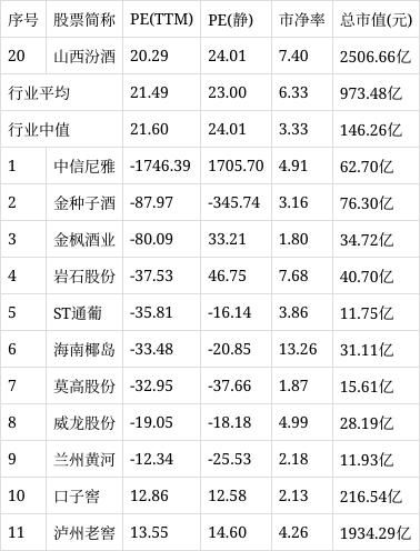 从行业市盈率排名来看,公司所处的酿酒行业行业市盈率平均21.49倍,行业中值21.60倍,山西汾酒排名第20位。
