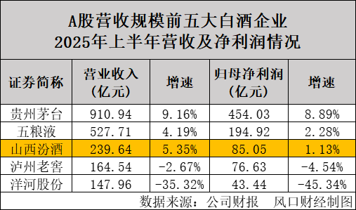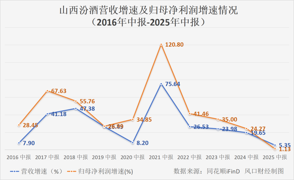 在此行业环境下,山西汾酒(600809.SH)的业绩增速延续放缓趋势。公司近日发布的2025年半年度报告显示,上半年实现营业收入239.64亿元,同比增长5.35%;归母净利润为85.05亿元,同比增长1.13%。无论是营收还是净利润增速,均创下自2016年以来公司半年度业绩的最低水平。