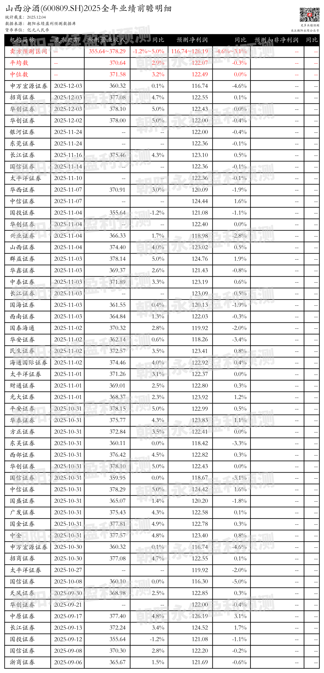 民生证券 认为: 山西汾酒 在2025年三季报中显示,公司营收和净利润均实现同比增长,其中营收329.24亿元,同比增长5.00%,归母净利润114.05亿元,同比增长0.48%。第三季度单季营收和净利润分别为89.60亿元和28.99亿元,同比分别增长4.05%和下降1.38%。在行业调整期,公司业绩表现优于同业。汾酒系列占比提升,省外市场招商活跃,渠道结构优化后招商补位工作开启。产品方面,汾酒收入同比增长4.97%,占比达98.18%,公司坚持四大系列产品矩阵,力图实现不同产品线的增长。区域上,省外营收同比增长31.14%,省内结构拉升战略受阻。经销商数量增加,渠道效率有望提升。毛利率环比修复,销售和管理费用率同比下降,税金及附加率同比上升。预计未来三年营收和净利润将持续增长,当前股价对应PE较低,维持推荐评级。