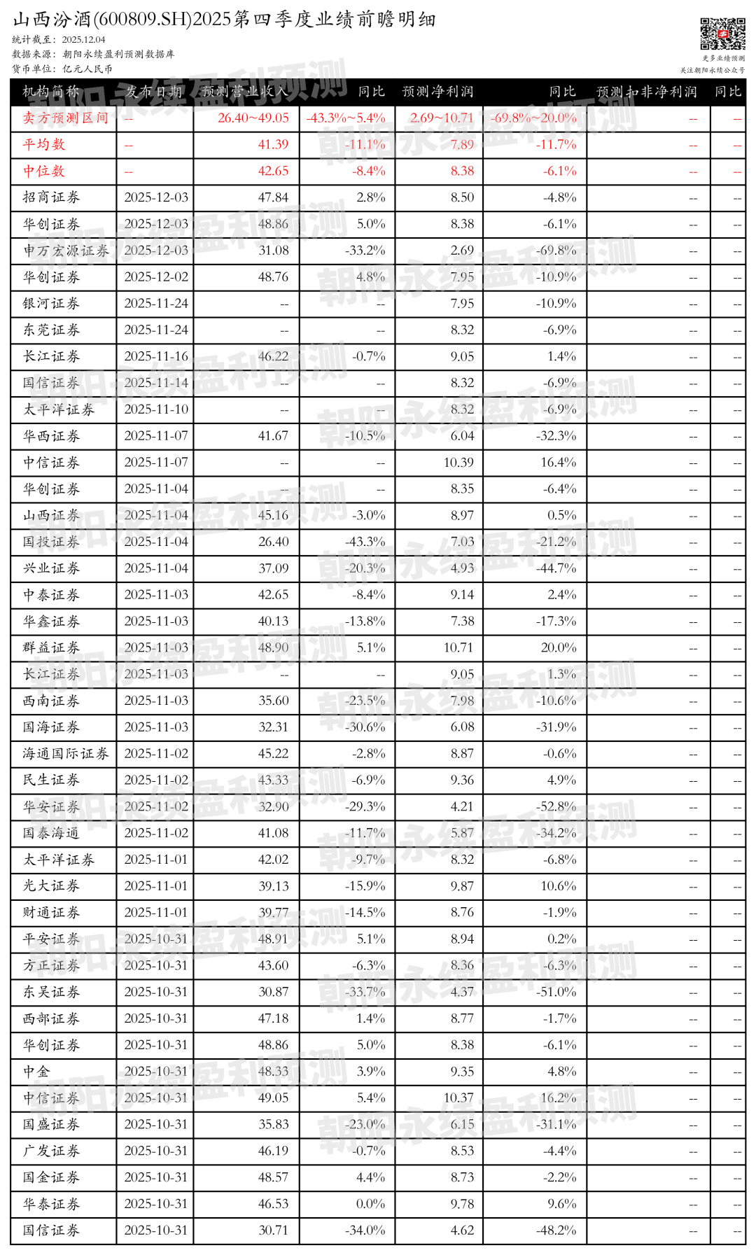 截至2025年12月04日,根据朝阳永续季度业绩前瞻数据: