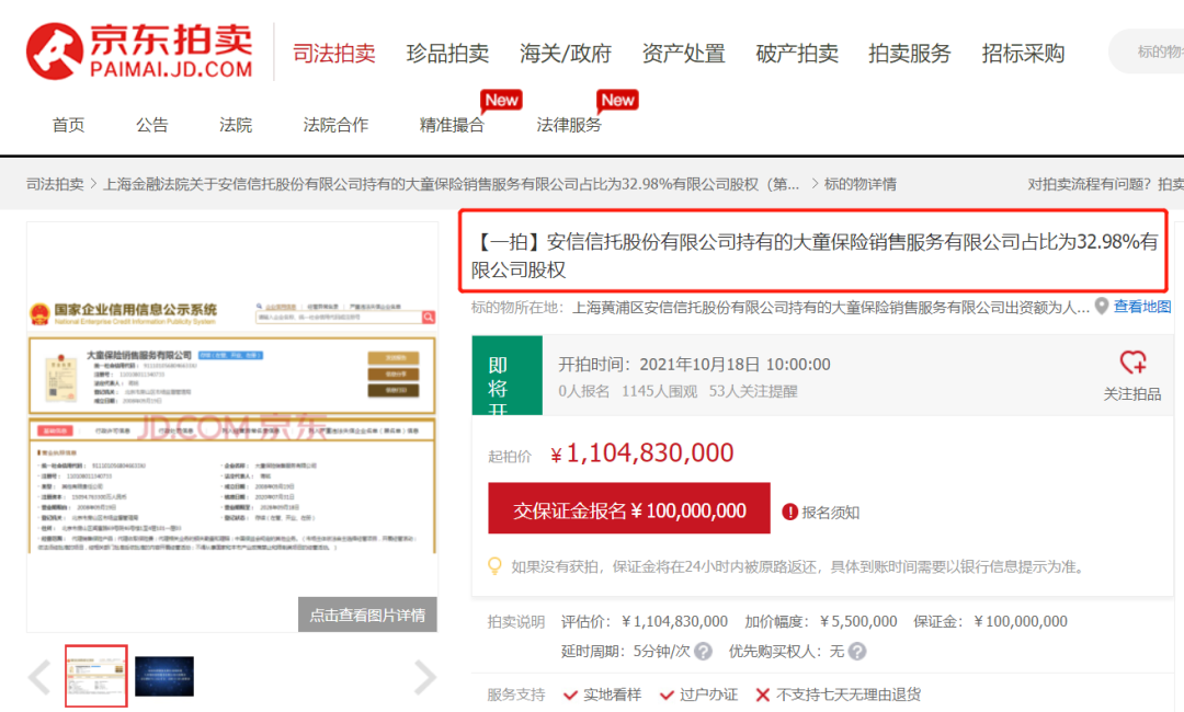 根据人民法院诉讼资产网发布的公告,安信信托持有的大童保险股权,出资额为人民币4978.1344万元,将于2021年10月18日10时起至2021年10月20日10时止(延时除外)在“京东网”进行公开网络司法拍卖,处置单位为上海金融法院。