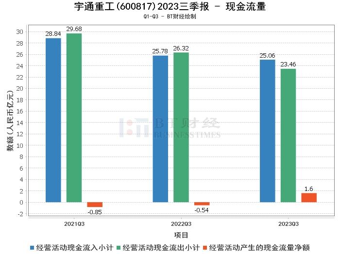 在现金流量方面,宇通重工2023年三季度经营活动产生的现金流量净额为1.6亿元,较上年同期的-5415.63万元有所改善。经营活动现金流入小计为25.06亿元,较上年同期的25.78亿元略有下降。经营活动现金流出小计为23.46亿元,较上年同期的26.32亿元有所减少。这些数据表明,公司的经营活动现金流量净额已由负转正,且现金流出有所减少,这可能是由于公司应收账款规模下降所导致。