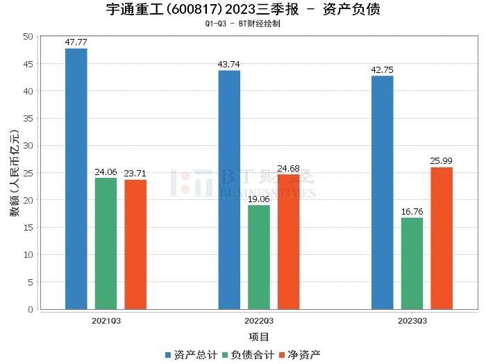 从资产负债方面来看,宇通重工2023年三季度末的总资产为42.75亿元,相比上年度末的47.31亿元,减少了9.62%。负债合计为16.76亿元,较上年度末的21.08亿元减少了20.44%。净资产为25.99亿元,较上年度末的26.22亿元略有下降。资产负债率为39.21%,较上年度末的44.57%有所下降。这些数据表明,公司的负债规模在减小,资产负债率也有所改善,但总资产和净资产的减少可能表明公司的运营规模在缩小。
