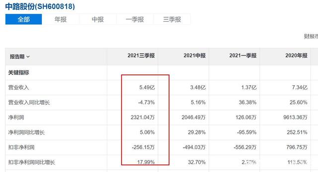 进入2021年,中路股份的业绩十分不稳定。截至2021年三季度,其营收为5.49亿元,同比下跌4.73%;净利润为2321.04万元,同比增长5.06%;扣非净利润亏损256万元。