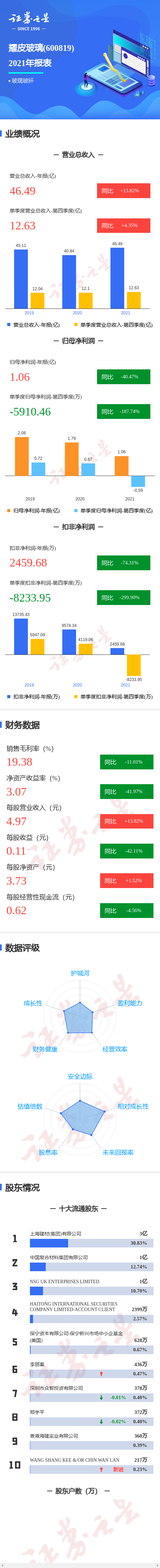 耀皮玻璃2021年报显示,公司主营收入46.49亿元,同比上升13.82%;归母净利润1.07亿元,同比下降40.47%;扣非净利润2459.68万元,同比下降74.31%;其中2021年第四季度,公司单季度主营收入12.63亿元,同比上升4.35%;单季度归母净利润-5910.46万元,同比下降187.74%;单季度扣非净利润-8233.96万元,同比下降299.9%;负债率37.97%,投资收益840.74万元,财务费用2351.48万元,毛利率19.38%。