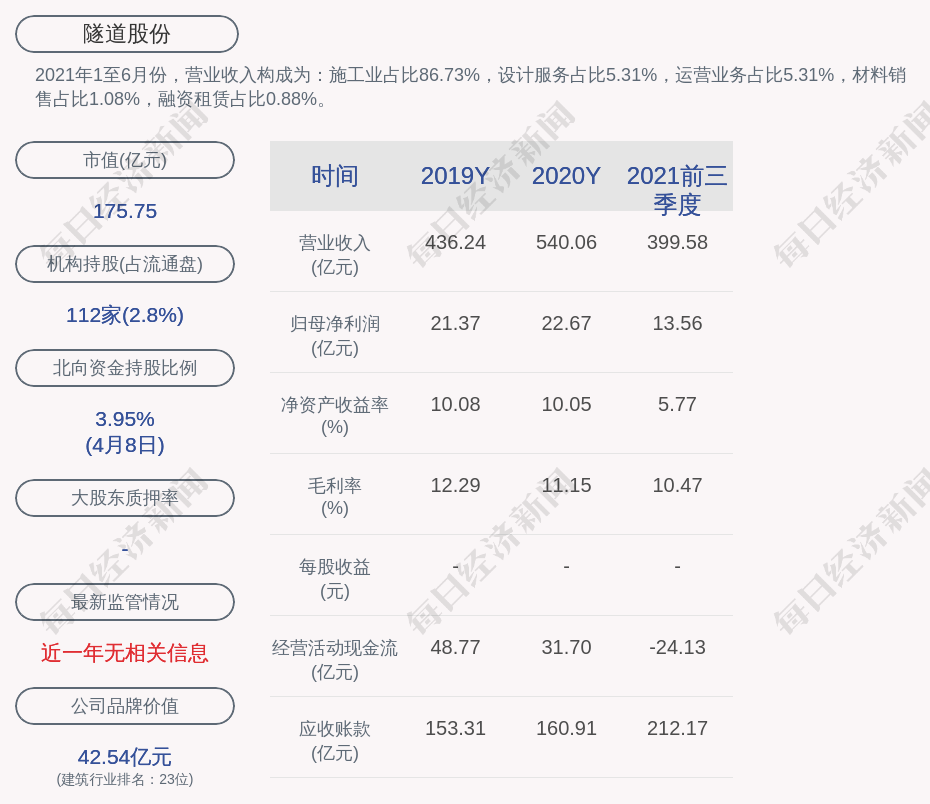 2021年1至6月份,隧道股份的营业收入构成为:施工业占比86.73%,设计服务占比5.31%,运营业务占比5.31%,材料销售占比1.08%,融资租赁占比0.88%。