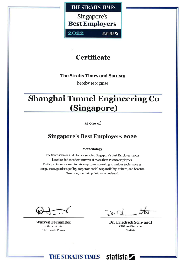 在由The Straits Times(海峡时报)和Statista共同主办的第三届新加坡最佳雇主评选活动中,隧道股份城建国际新加坡区域中心荣膺2022年度新加坡最佳雇主。这是继去年首届评选上榜之后,隧道股份城建国际又一次蝉联获颁此殊荣,展现了企业在全球疫情侵袭的情况下全力保障员工职业健康安全、职场发展等方面所取得的杰出业绩,也体现了隧道股份城建国际社会责任与经济责任并举共赢的价值主张。