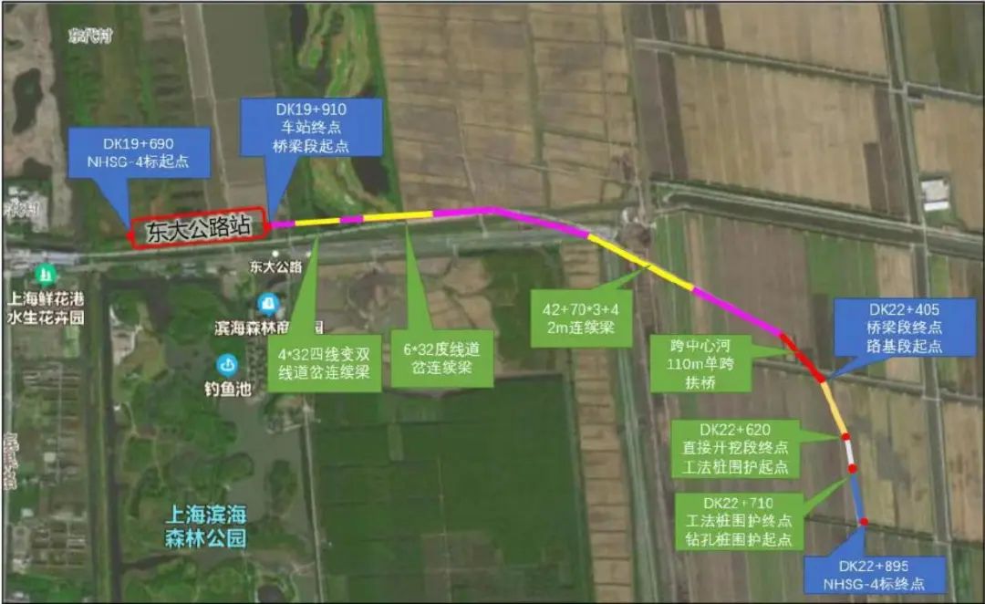 南汇支线(两港市域铁路)线路全长约34.86公里,北起浦东枢纽(上海东站和规划T3航站楼),主线自T3航站楼引出,进入临港新片区中央活动区;支线自上海东站引出,沿申嘉湖高速南侧接入下盐路站,全线新设车站4座、接轨站2座。其中,由隧道股份市政集团承建的南汇支线(两港市域铁路)NHSG-4 标工程包含长度3.2公里的东大公路站主体和附属结构、桥梁区间和路基区间等。