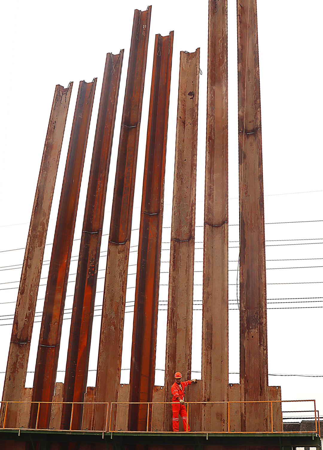 项目团队在银都路闵行敞开段应用HUW预制型钢插板工艺。该工艺使用预制钢板桩替代搅拌桩止水,相较传统SMW工法桩施工,实现围护结构水泥“0添加”,同时无需等待围护结构龄期即可快速开挖;与传统拉森钢板桩相比确保止水性能的同时,刚性则更好。进一步节约建设成本,工序工期节省60%。