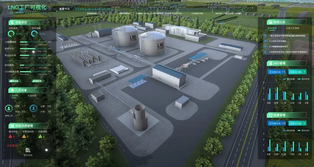 作为项目服务方,隧道股份上海能建从工程设施数据、数字底座平台、应用赋能、可视化管理、综合展示四大方面进行建设,构建上海 LNG 接收站数字孪生体,建设以安全风险智能化管控为核心的相关应用,开发相应的应用功能模块,实现“全数字化交付、全业务应用场景覆盖、全生命周期管理、全智能化运营”的LNG数字化转型与智能工厂标杆示范。