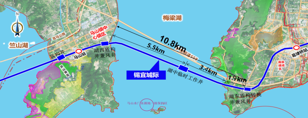 锡宜S2线起自宁杭高铁宜兴站,经宜兴城区、经开区、周铁,穿太湖,经马山至太湖新城,全长约61.29公里。隧道股份上海隧道承建的土建09工区梅梁湖段隧道主要施工内容包括:梅梁湖西工作井(含)~湖中井~梅梁湖东转换井(含)范围内所涉及的土建、盾构区间工程,其中隧道总长度约10.8公里(含陆域段约1.9公里),隧道外径13.6米。隧道埋深约11~29米,在湖中将设临时工作井用于盾构接收。