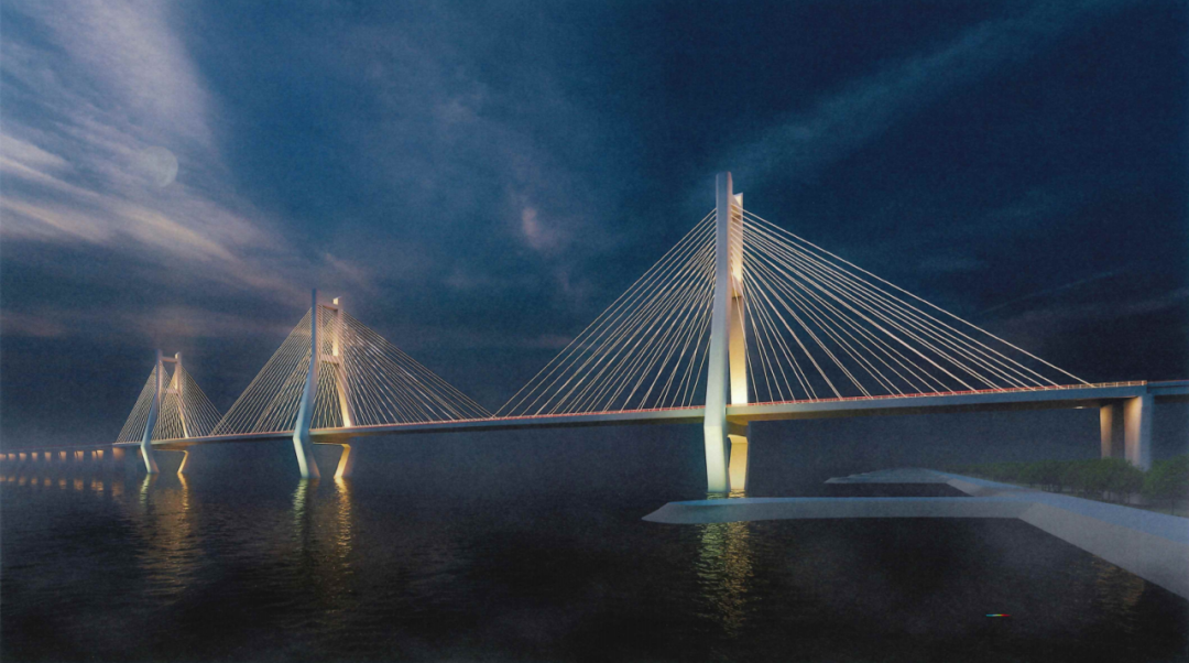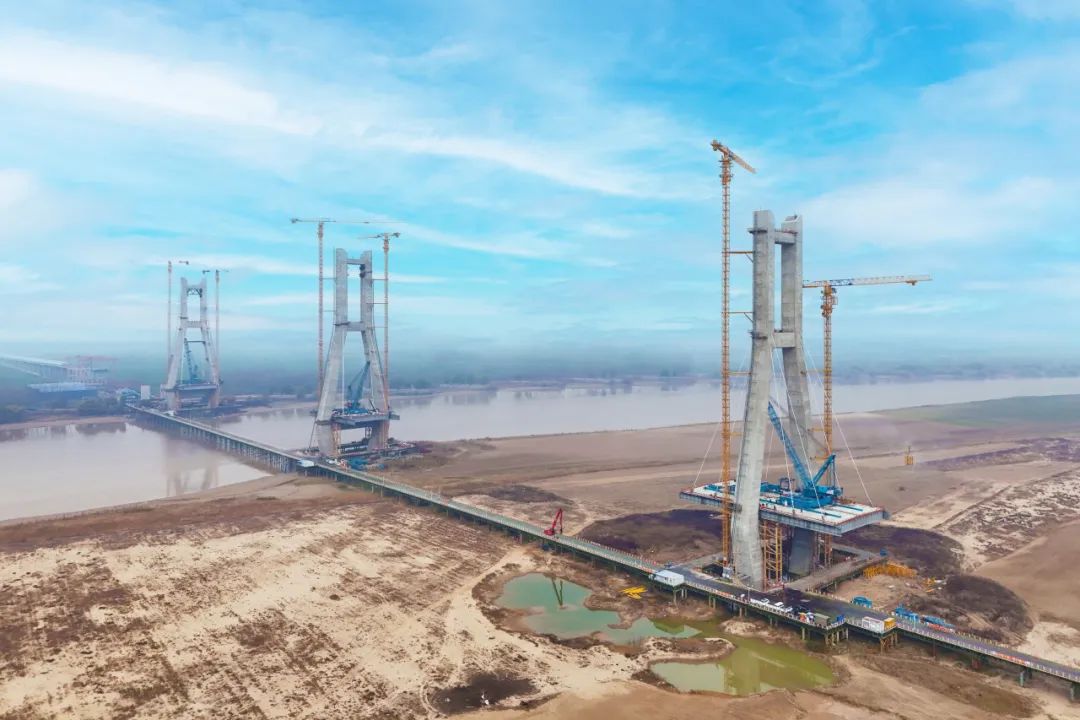兰原高速兰考至封丘段项目是河南省高速公路“13445工程”重点建设项目,线路全长30.263公里,主线采用双向六车道高速公路标准,设计时速120公里/时。其中黄河大桥全长9104米,主桥采用主跨(140+360+360+140)米的三塔双索面半漂浮体系钢与混凝土组合梁斜拉桥设计。主梁采用双边“工”字型边主梁结合桥面板的整体断面设计,全宽38米;索塔采用鼎式桥塔,边塔高154.3米,中塔高160.5米,建成后将如同一座巨大的竖琴屹立于黄河之上,服务中原百姓的交通出行。