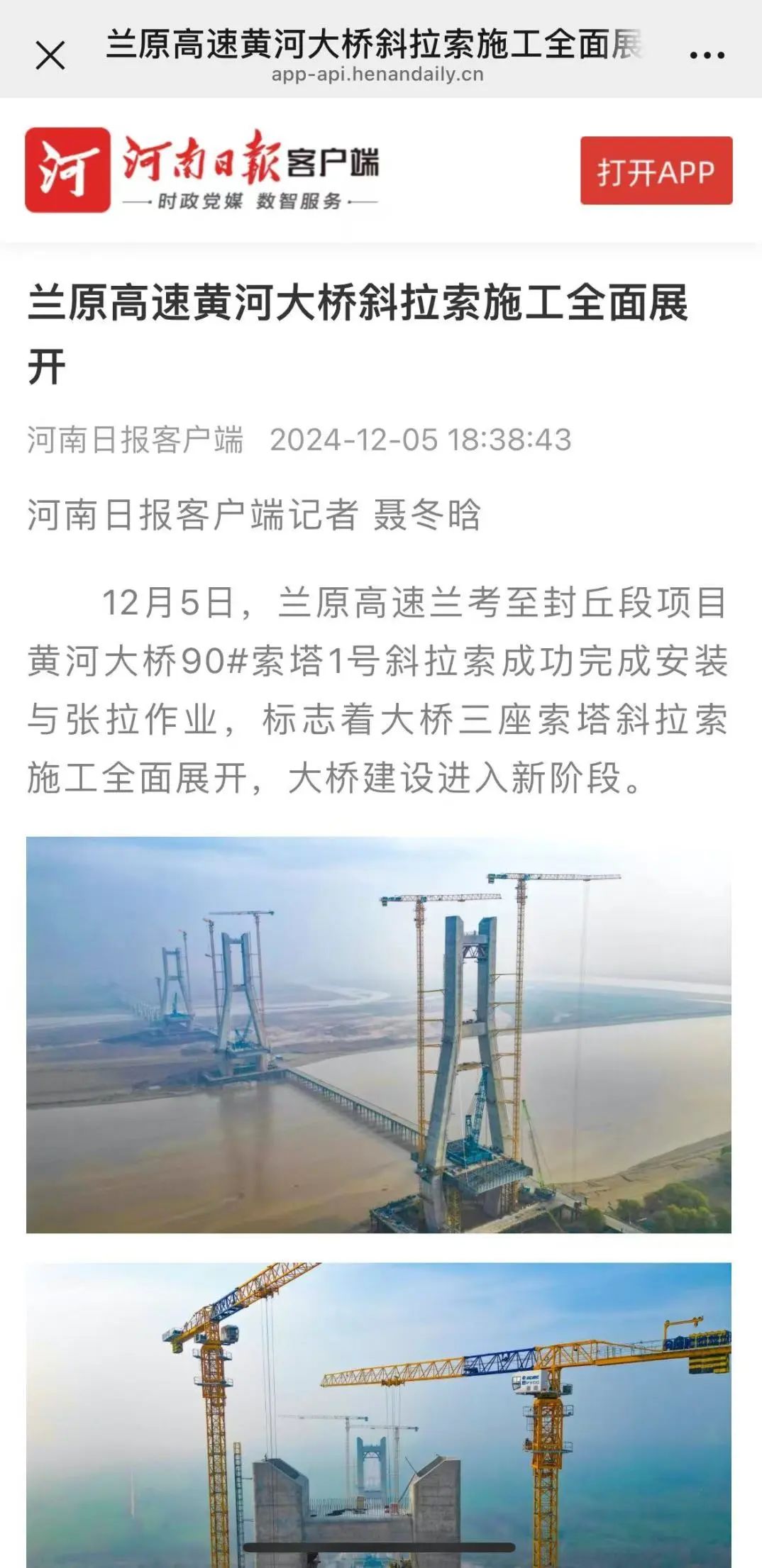 12月5日,由隧道股份建设的兰原高速兰考至封丘段项目黄河大桥90#索塔1号斜拉索成功完成安装与张拉作业,标志着黄河大桥索塔斜拉索施工全面展开,大桥建设进入新阶段。