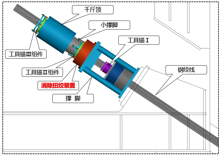 黄河大桥主桥89#墩桥塔的 J12~J16 索,索长约176~222米,采用塔端钢绞线软、硬组合牵引方式,施工过程中钢绞线易出现整体扭绞,影响施工安全。隧道股份市政集团项目团队在钢绞线软牵引系统中的工具锚与撑脚之间设置了消除扭绞装置,当钢绞线发生整体扭绞后,消除扭绞装置可以带动工具锚和千斤顶进行转动从而消除钢绞线整体扭绞的状态,保障斜拉索挂设安全。