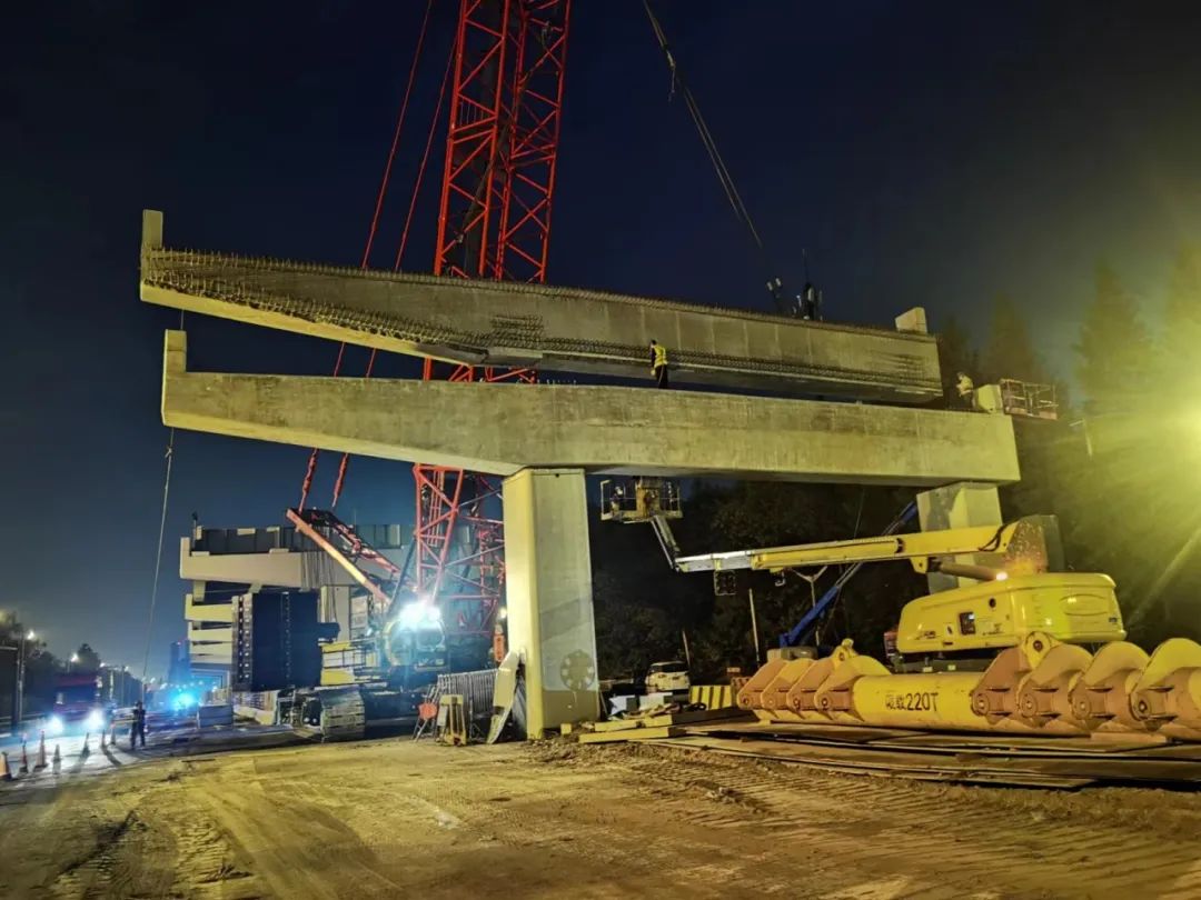 除了顶升高度在业内“首屈一指”,项目还采用了预制装配施工工艺,预制装配率高达95%。在涉铁段作业期间,项目团队更创新打造了国内首例预制装配纵向分片盖梁设计及施工技术,将盖梁横向分为两片,分开预制、依次吊装,实现“轻量化”装配施工。