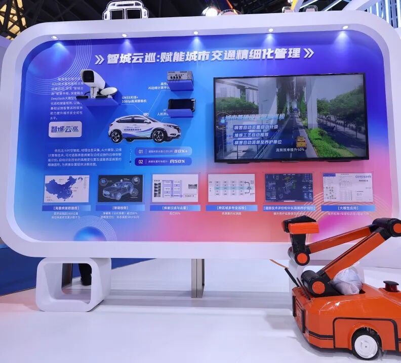 大型交通设施是城市的“动脉血管”,也是城市安全保障的核心部位。在本次展会上,隧道股份城市运营展示以AI技术重构基础设施运维范式,研发饿“智城云巡”智慧巡检系统,深度融合DeepSeek大模型与轻量化巡检装备矩阵,以城市基础设施智慧巡检服务助力提升城市安全韧性水平。该系统依托北斗时空智能、地理信息采集、AI大模型、边缘计算等技术,自动识别目标的高精度位置及道路表面病害的精确面积,为病害处置提供决策依据,以科技力量守护城市交通的安全与畅通。