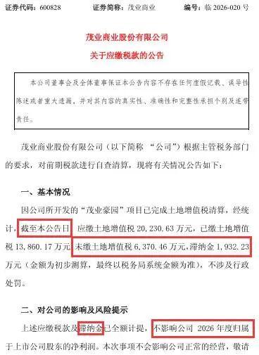 另外,还剩下6370多万元土增税未交,后面还得继续产生滞纳金吧,这些滞纳金也得是2026年的亏损吧?当然了,公告仅提及上述已计提的滞纳金,而未提及未来的滞纳金。