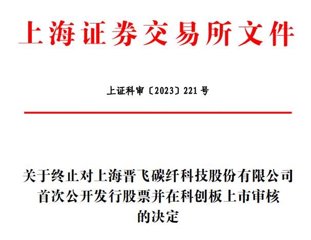 2023年4月28日,晋飞碳纤和保荐人海通证券股份有限公司向上交所提交了《上海晋飞碳纤科技股份有限公司关于撤回首次公开发行股票并在科创板上市申请文件的申请》(沪晋司董(2023)字第[2]号)和《海通证券股份有限公司关于撤回上海晋飞碳纤科技股份有限公司首次公开发行股票并在科创板上市申请文件的申请》(海证〔2023〕756号),申请撤回申请文件。根据《上海证券交易所股票发行上市审核规则》第六十三条的有关规定,上交所决定终止对晋飞碳纤首次公开发行股票并在科创板上市的审核。