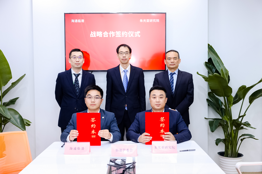 在临港新片区党工委委员、管委会专职副主任唐浩,海通证券上海分公司副总经理于涵,朱光亚研究院总工程师、平台公司总经理田广见证下,海通证券临港分公司副总经理胡李祥,朱光亚研究院平台公司总经理助理刘艳龙分别代表双方签署战略合作协议。