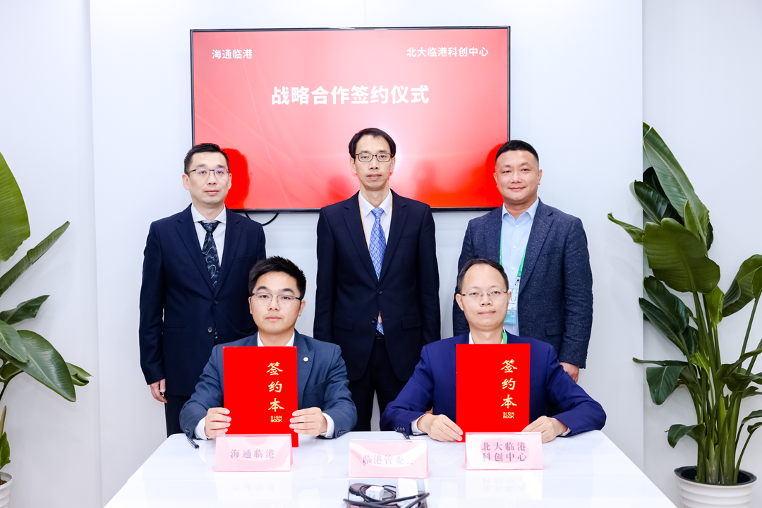 在临港新片区党工委委员、管委会专职副主任唐浩,海通证券上海分公司副总经理于涵,北大临港科创中心执行主任王宇见证下,海通证券临港分公司副总经理胡李祥、北大临港科创中心主任助理张炜炜分别代表双方签署战略合作协议。