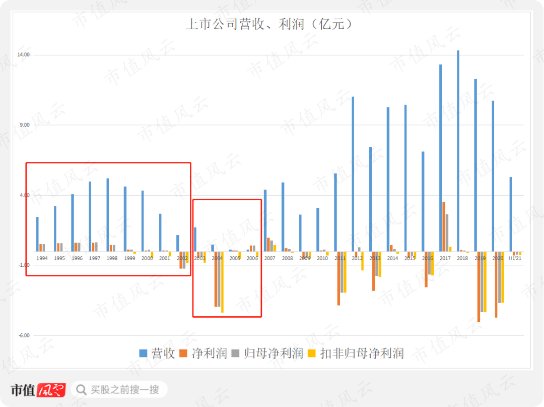 2018年,公司在盈亏平衡线挣扎,2019和2020年均巨亏,2021年上半年继续亏损,目测离重新带帽又不远了。