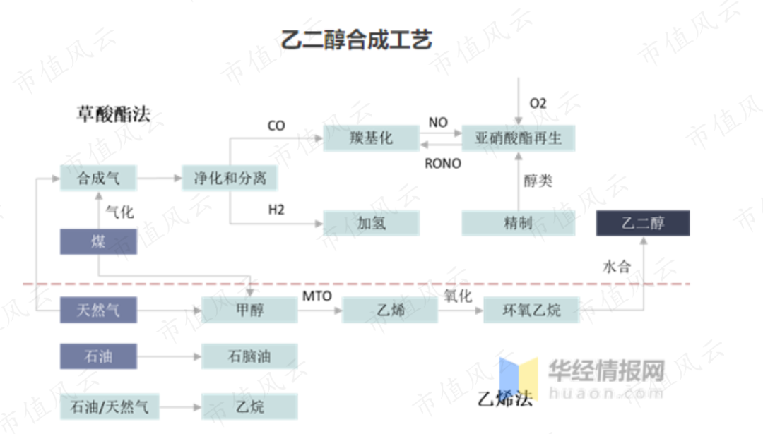 根据原料不同,乙二醇的生产工艺分为石油路线和煤基路线两种。