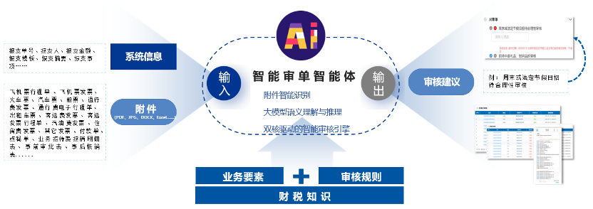 通过深度语义理解与分析,实现对复杂场景的智能辨识与推理,并附上AI分析疑点,提示财务人员重点关注和复核。随着审核数据积累和人工反馈,不断优化其判断模型,越用越“懂”业务。