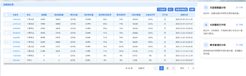 实现季度装期计划由“人工”编制转为“人工+智能”编制。模型参数可调整权重,支持生成多个版本的装期计划,并从多个维度分析模型计算结果的质量高低,支撑智慧化的采购决策。