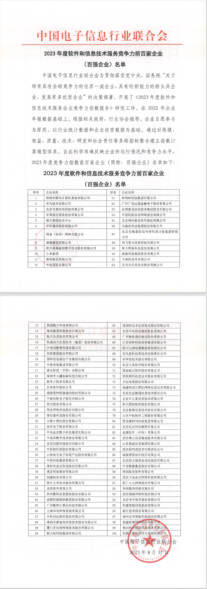 2023年8月31日,中国电子信息行业联合会在天津举办了“2023第二十五届中国国际软件博览会,并公布了“2023年软件和信息技术服务企业竞争力报告及前百家企业”名单,该名单通过对企业规模、效益、质量、技术、研发和社会责任等多维指标进行评估,力求科学准确反映企业的运行情况和竞争力水平。电科数字凭借稳步增长的业务规模和核心竞争力位列“2023年软件和信息技术服务企业竞争力前百家企业”名单第33名。