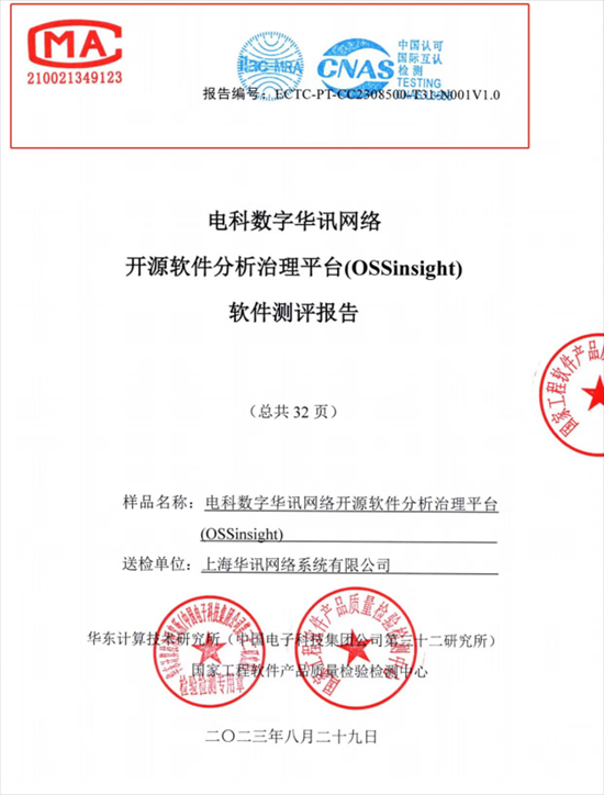 2023年8月,电科数字华讯网络开源软件分析治理平台(OSSinsight)通过了中国信息通信研究院(以下简称“信通院”)的能力评估,获得可信开源治理工具能力检验证书,同时通过国家工程软件产品质量检验检测中心的测评取得测评报告。通过认证和测评标志着公司在开源软件治理领域的能力得到了国内权威机构的认可,软件产品质量达到了行业领先水平。