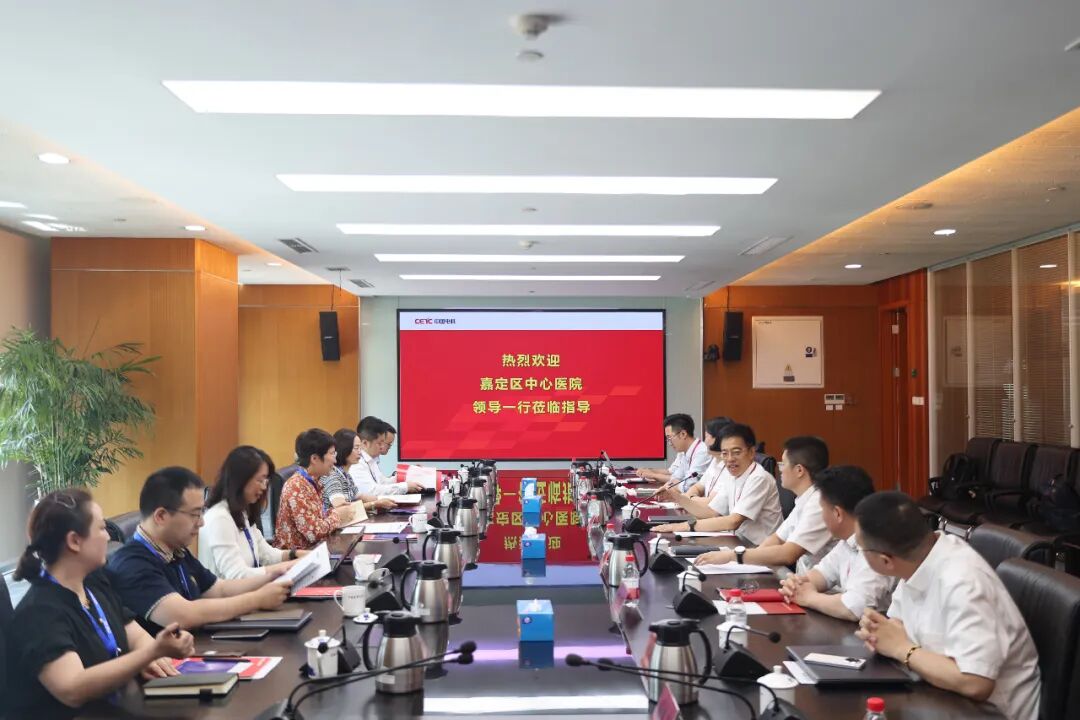 6月17日,嘉定区中心医院院长戴慧莉带队赴电科数字调研,嘉定区中心医院党委副书记、纪委书记朱成英,副院长周争参加本次交流活动,电科数字党委书记、董事长,32所党委书记江波陪同接待。