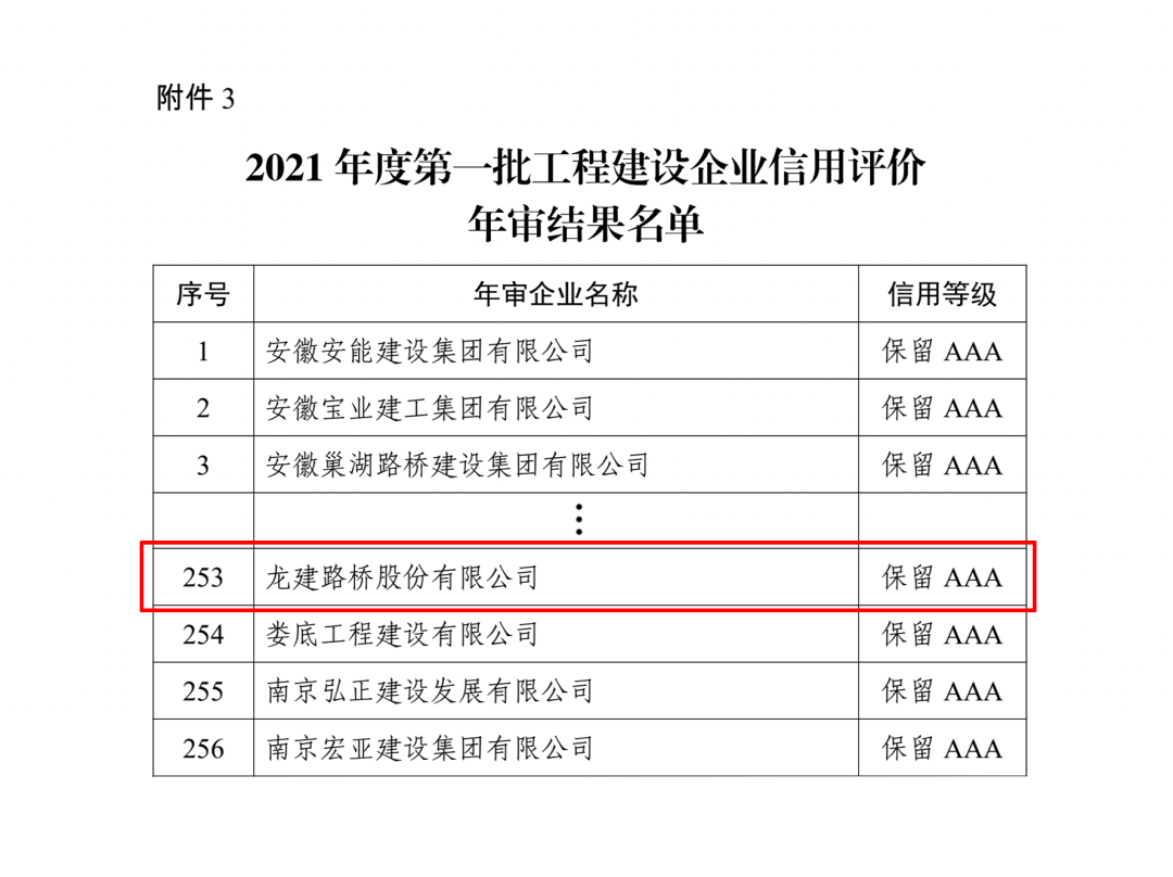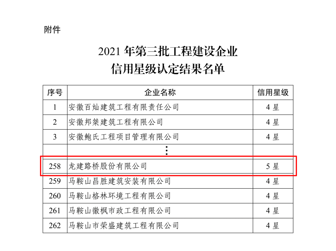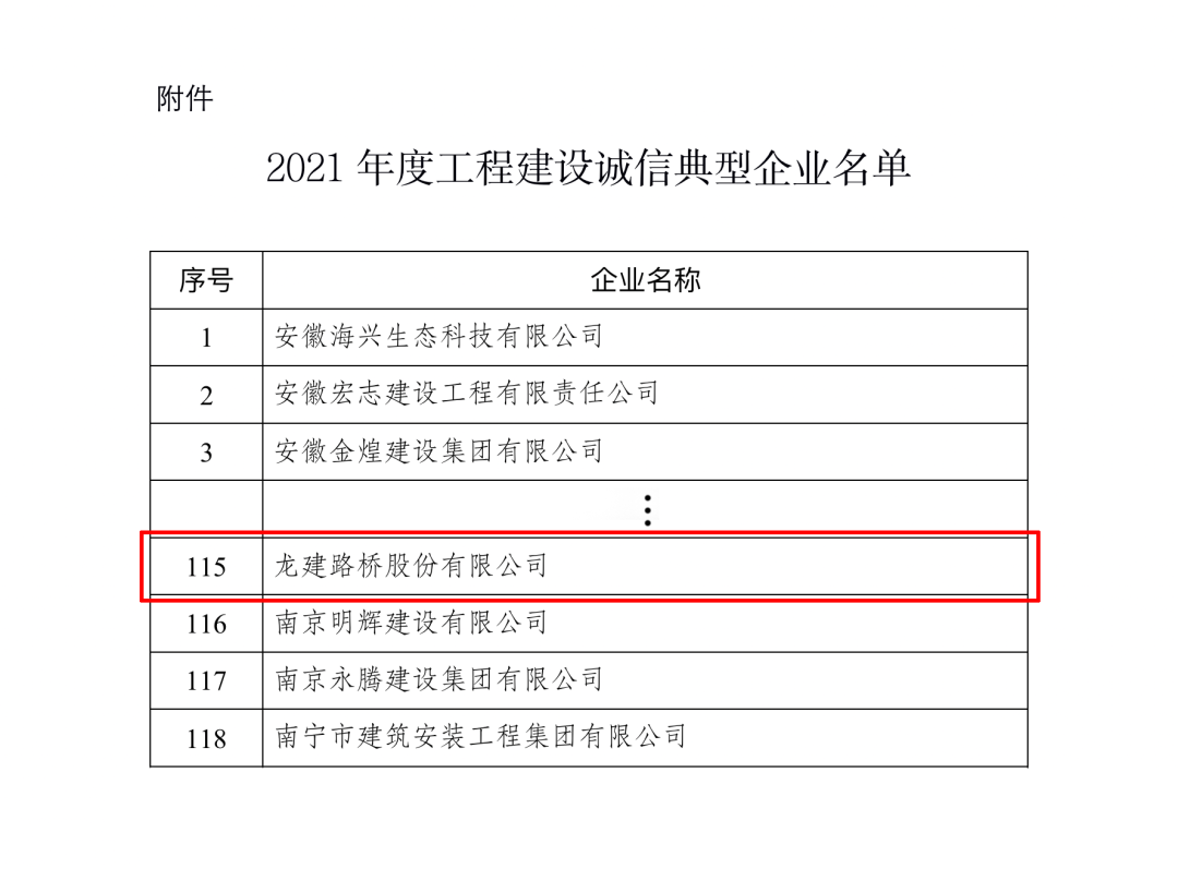 近日,中施企协2021年度工程建设诚信企业推介大会胜利召开,会议发布了2021年工程建设行业诚信建设成果,对2021年度工程建设AAA信用等级企业、工程建设诚信典型企业、工程建设信用星级企业等进行了推介发布。龙建股份被复评为“工程建设企业社会信用评价AAA级信用企业”,并再度获得“工程建设诚信典型企业”荣誉称号,企业信用星级认定由四星升级为五星。