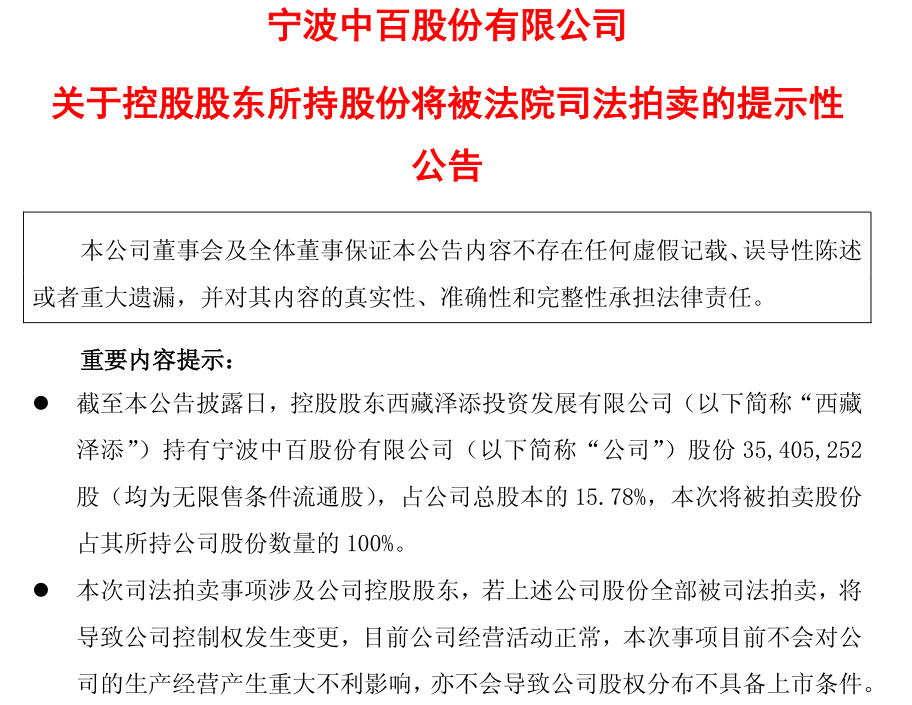 近日,宁波中百公告称,公司控股股东西藏泽添投资发展有限公司(简称:西藏泽添)所持公司股份将于11月22日清仓拍卖。