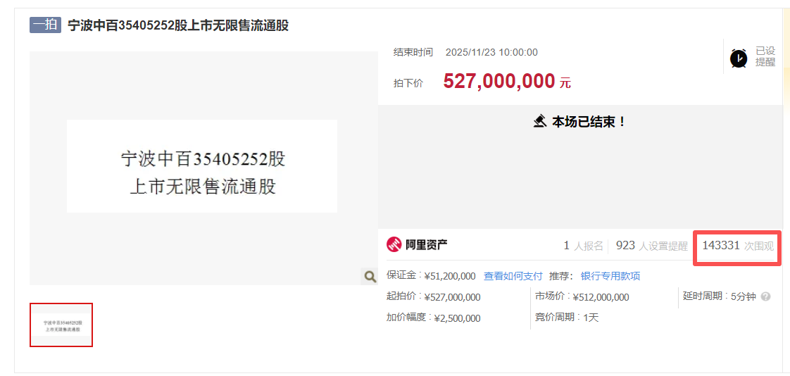 11月23日上午10时,阿里资产拍卖平台显示, 宁波中百 3540.53万股上市无限售流通股的拍卖正式结束。