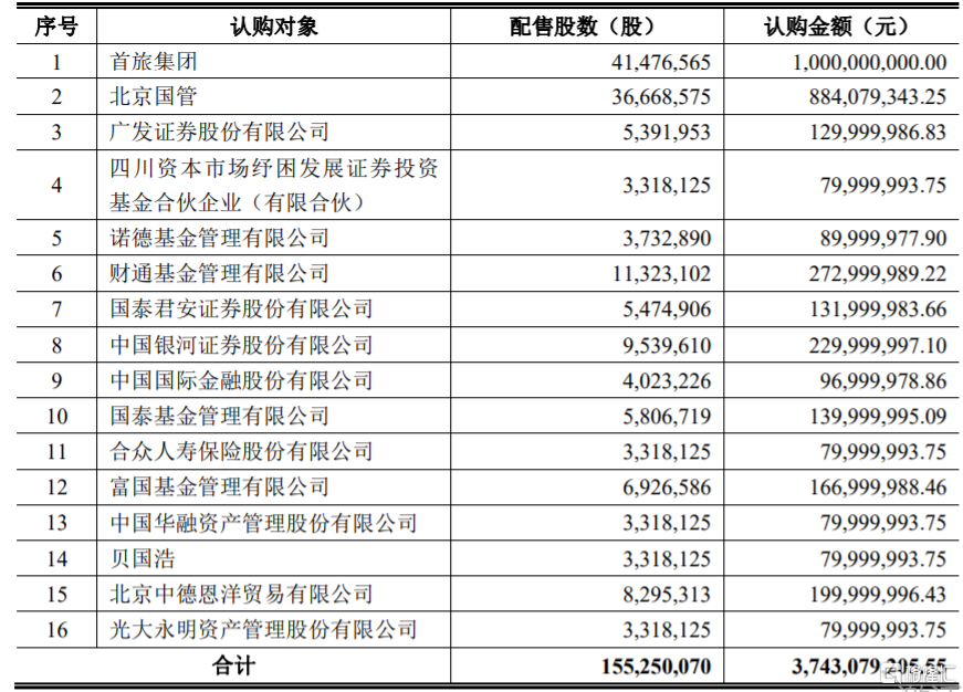 格隆汇12月10日丨王府井(600859.SH)公布公司换股吸收合并北京首商集团股份有限公司并募集配套资金暨关联交易之非公开发行股票发行情况报告书,确定此次发行价格为24.11元/股,发行股份数量总数为1.55亿股,募集资金总额为37.43亿元。此次发行最终配售结果如下: