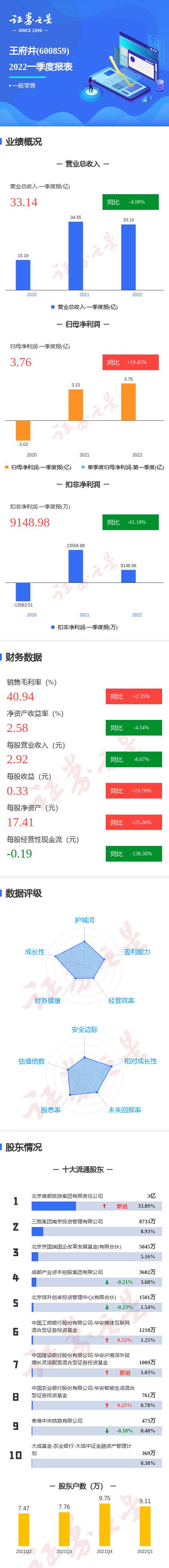 王府井2022一季报显示,公司主营收入33.14亿元,同比下降4.08%;归母净利润3.77亿元,同比上升19.45%;扣非净利润9148.98万元,同比下降61.18%;其中2022年第一季度,公司单季度主营收入33.14亿元,同比下降4.08%;单季度归母净利润3.77亿元,同比上升19.45%;单季度扣非净利润9148.98万元,同比下降61.18%;负债率46.97%,投资收益2.97亿元,财务费用9015.01万元,毛利率40.94%。