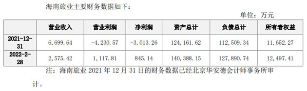 2021年,海南旅业营业收入6,699.64万元,但净利润为-3,013.26万元;2022年前两个月营业收入为2,575.42万元,净利润845.14万元。截至2022年2月28日的总资产14.04亿元中,所有者权益1.25亿元,负债总计达12.79亿元。