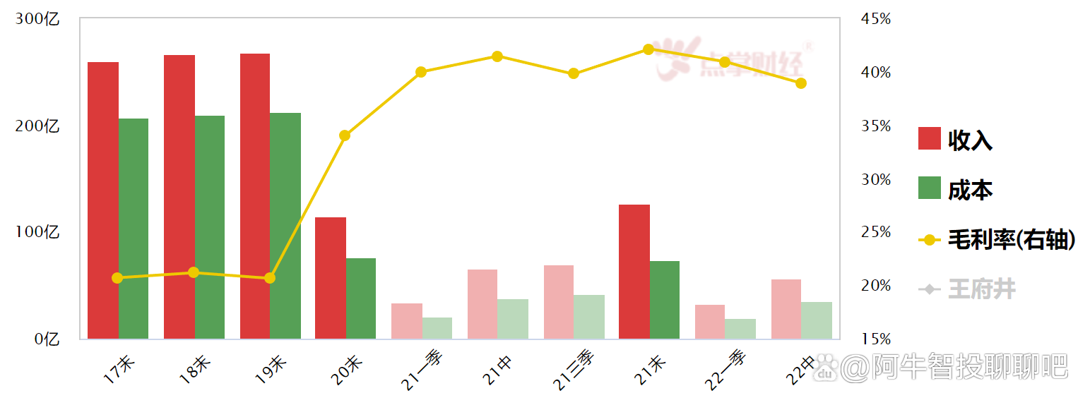 从历年收入来看,受疫情影响,2020年开始王府井的收入大幅下滑,到2021年略有上升,幅度不大。2022年半年报数据显示,王府井收入57.40亿元,毛利率为39%,净利润3.82亿元。