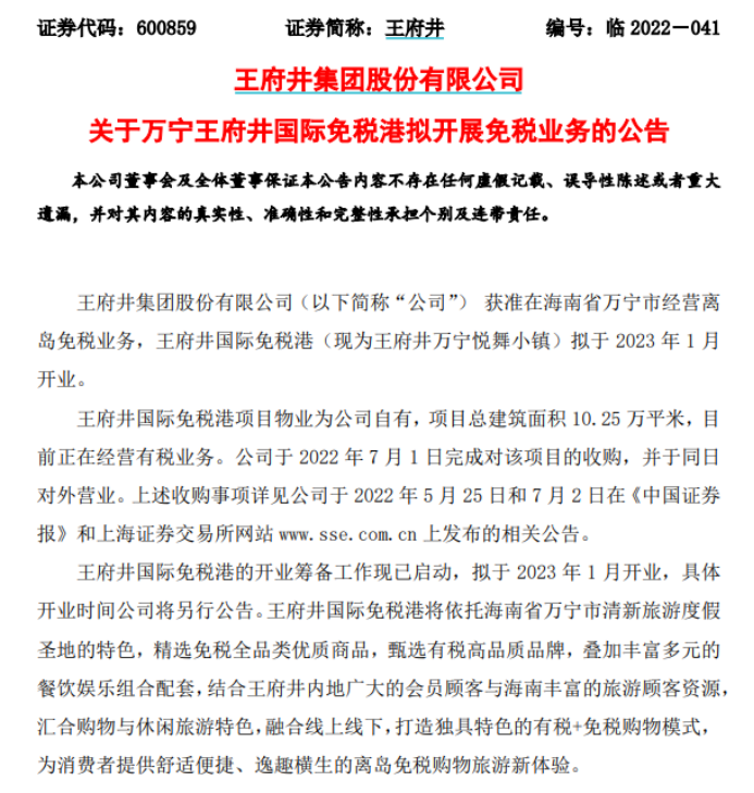 借着海南自由贸易港和国际旅游消费中心的东风,王府井正式获准在海南省万宁市经营离岛免税业务,王府井国际免税港将于2023年1月正式开业。