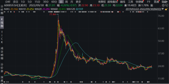 不过,自王府井2020年6月获得免税品经营资质,股价大幅冲高至77.44元/股后,公司股价总体呈现下跌趋势,截至最新收盘日,股价报21.81元/股,较高点跌幅超70%。
