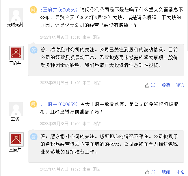股价方面,节前的9月28日,王府井股价曾放量跌停,对此,公司董秘在互动平台上回应称,公司被授予的免税品经营资质不存在取消的概念,公司始终在全力推进免税业务落地的各项准备工作。目前公司的经营及发展均正常,无应披露而未披露的重大事项。股价受多种因素的影响,恳请广大投资者注意理性投资。