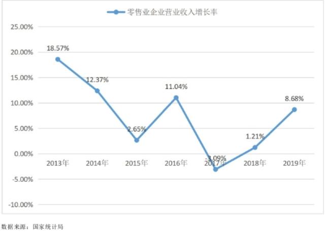 如下图所示,2013 年到 2015 年,零售业企业营业收入增长趋势逐渐减缓,2017 年甚至出现负增长,2018 年和 2019 年虽有所回升,但相较于前几年,增长趋势并不乐观。