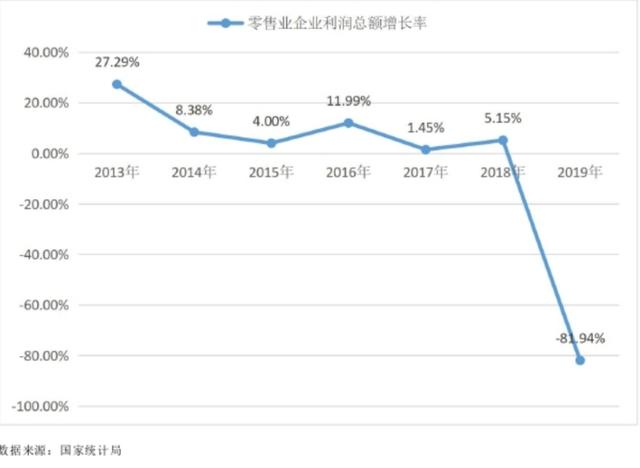 从下图可以看出,2013-2019 年零售业企业利润总额增长率整体也呈现下降趋势,2019 利润总额下降近 82%。但根据国家统计局统计数据来看,社会零售品消费总额处于持续增长状态,在市场处于快速增长状态的背景下,零售业企业盈利能力呈现较低水平且增长势头不足,因此亟需创新商业模式以适应市场发展。