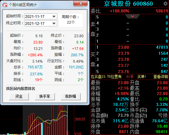 二级市场上,自11月17日至12月17日,京城股份近一个月累计涨幅达286.4%,市值也从不到30亿飙升至115亿。