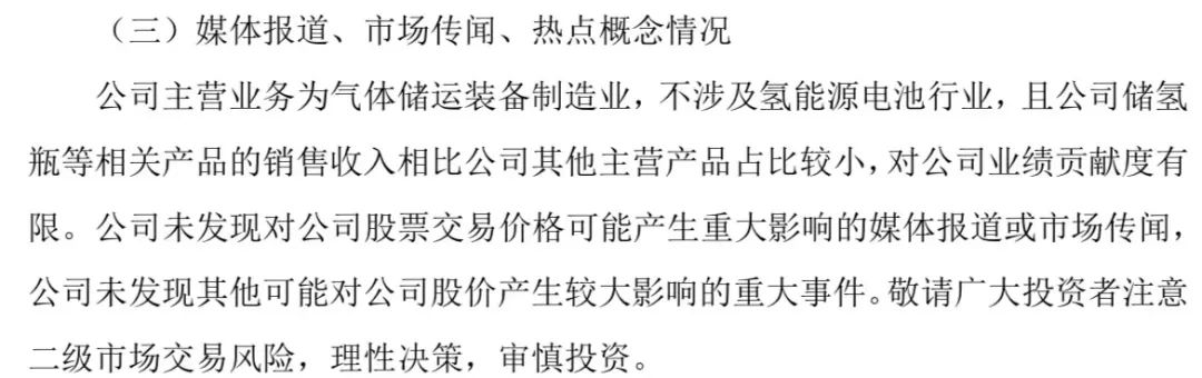 12月9日,公司二度披露风险提示公告称,其主营业务为气体储运装备制造,不涉及氢能源电池行业,且储氢瓶等相关产品的销售收入相比其他主营产品占比较小,对业绩贡献度有限。