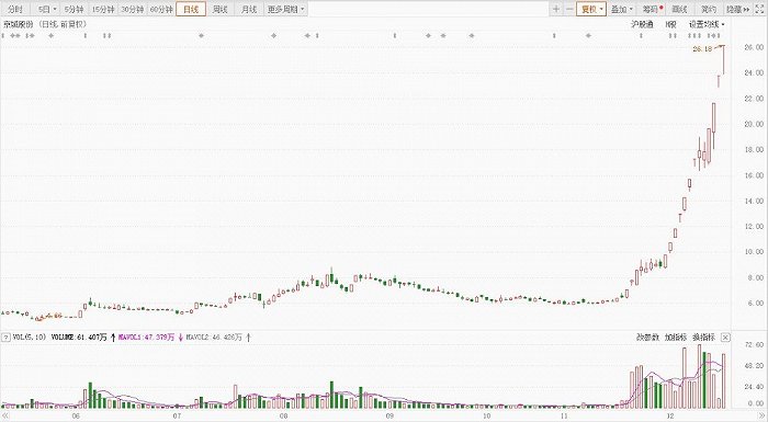 11月15日是星期一,这天,京城股份的股份开于6.15元/股,此后开启了一个多月的快速上涨进程,截至12月20日(星期一)股价已经涨至26.18元。在此期间,京城股份的股价收获多个涨停板,区间涨幅达到325.69%。