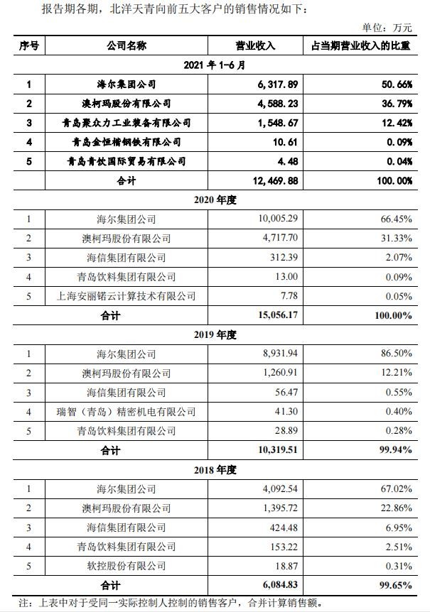 根据财务数据和业绩承诺,北洋天青净利润将在几年之内从900多万增长到4600万。然而,按近年的情况看,北洋天青的营业收入几乎来自前五大客户。报告期各期(2018-2020年以及2021年1-6月,下同),北洋天青前五大客户营业收入占当期营业收入的比重分别为99.65%、99.94%、100%、100%。对此,证监会在问询中提到,北洋天青存在主要客户销售集中度较高的情况。