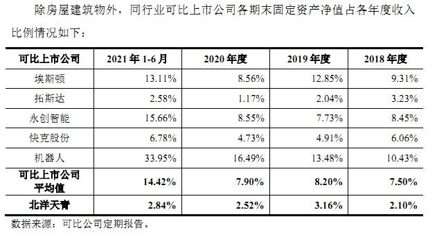 不过,除去房屋建筑物之外,报告期各期末,北洋天青固定资产占营业收入比重仍然低于可比上市公司平均值,相差5.4%、5.04%、5.38%和11.58%。